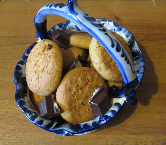 Все смешать до получения густой массы. Всыпать шоколад. - Выкладывать ложкой на противень, устланный бумагой для выпечки или скатать шарики и слегка приплюснуть. Учтите, что они очень сильно увеличиваются в объеме.